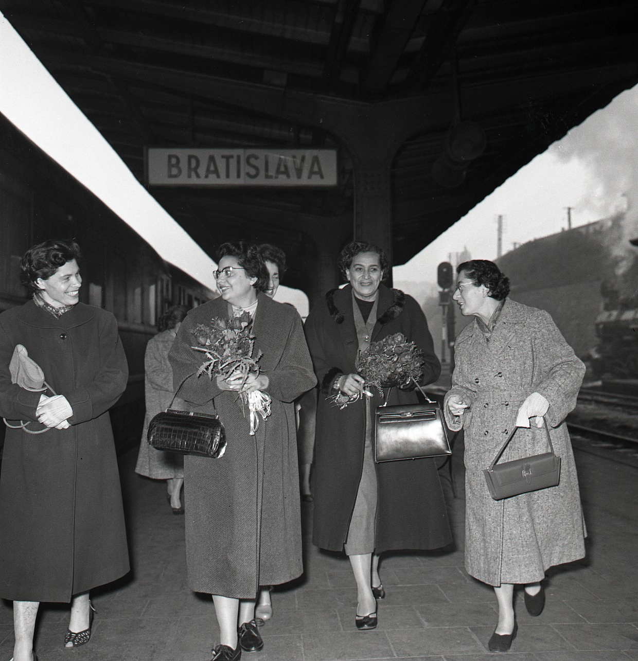 A delegation of Egyptian women visiting Czechoslovaia at the invitation of the Czechoslovak Women’s Committee. The members of the delegation, Ms. Zenab Hassan and Leila Elkhatib, were welcomed at the main station in Bratislava by Lila Hojčová, chief secretary of the Czechoslovak Women’s Committee in Slovakia, and Margita Slepčanová, vice-chairwoman of the Central National Committee in Bratislava, 1957. Author: TASR/Viliam Pribyl