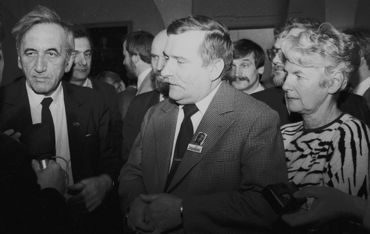 Zofia Kuratowska (first on the right) together with future Prime Minister Tadeusz Mazowiecki (left) and future President Lech Wałesa (centre) during the first day of the Round Table Talks in Warsaw, 1989 Sygnatura: OK_0895_0014_031